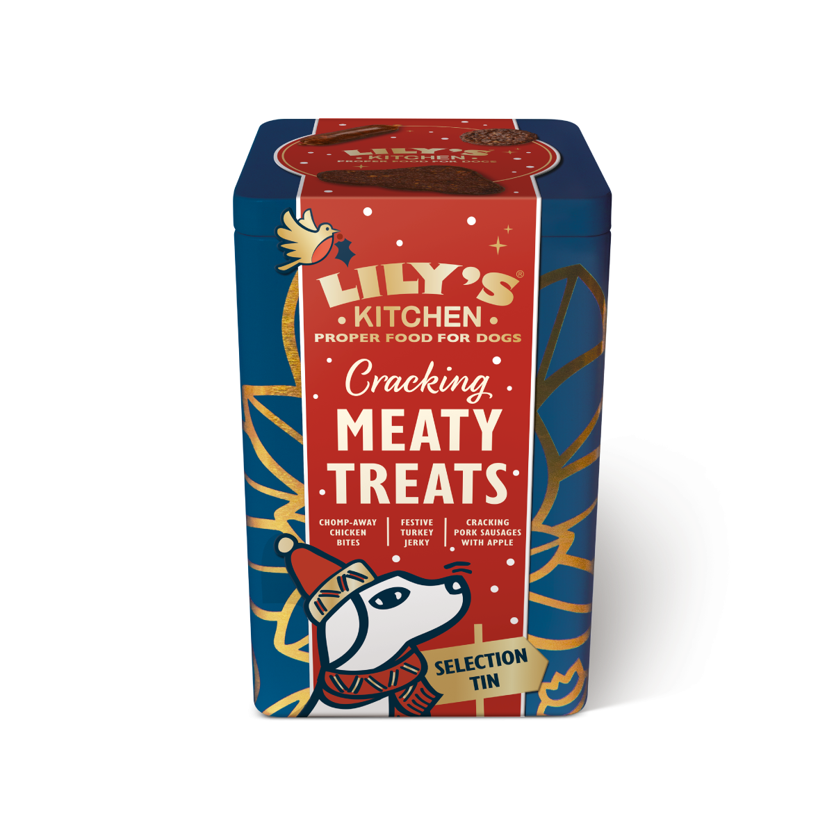 Discover the Lily's Kitchen Baked treat tin filled with 3 kinds of cookie: