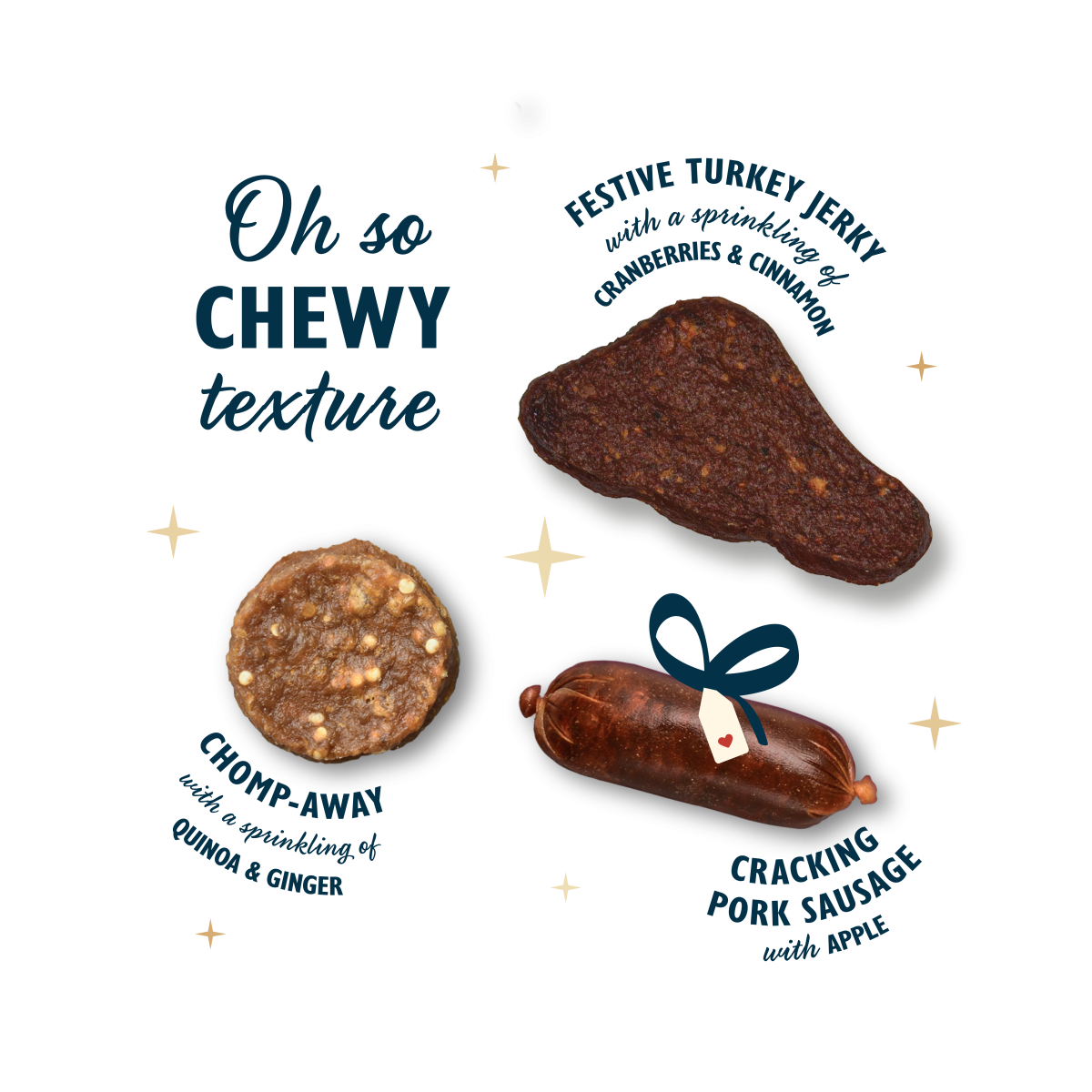 Festive dried turkey: Turkey* (68%), pea protein powder*, vegetable glycerine (derived from rapeseed oil), pumpkin seeds*, distilled white vinegar, dried cranberries (0.3%), cinnamon* (0.1%), thyme*. *Natural ingredient.