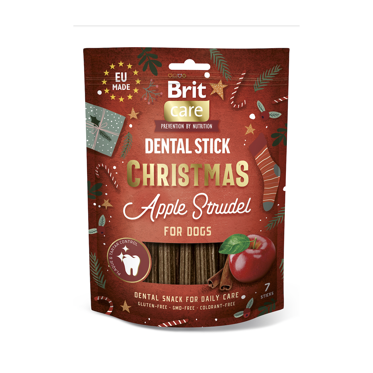 Give your dog the gift of delicious Brit Care Dog Dental Sticks with the festive taste of apple strudel. These sticks not only clean your dog's teeth and promote good oral health, they also offer a soothing chewing property that relaxes your four-legged friend.