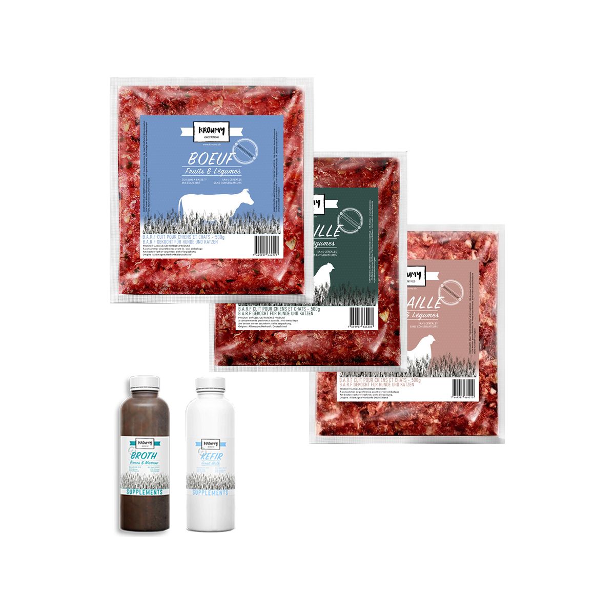 • Composition: 65% poultry (carcass, skin and offal), 10% salmon, 10% beef (heart and liver), 10% vegetables and fruit (apple, carrot, parsley), 5% veal breast.