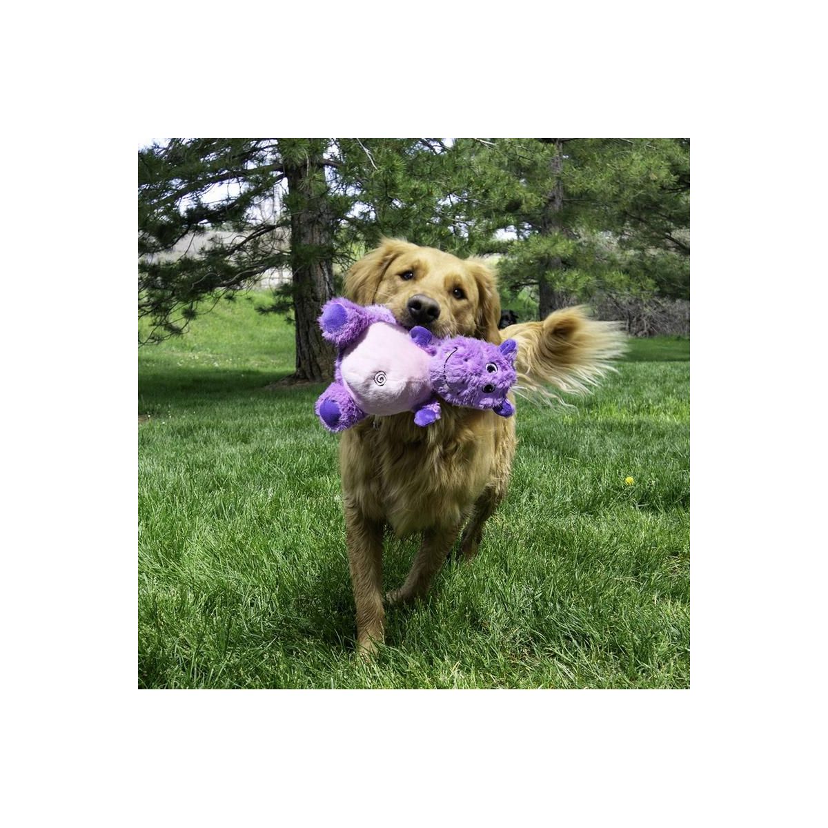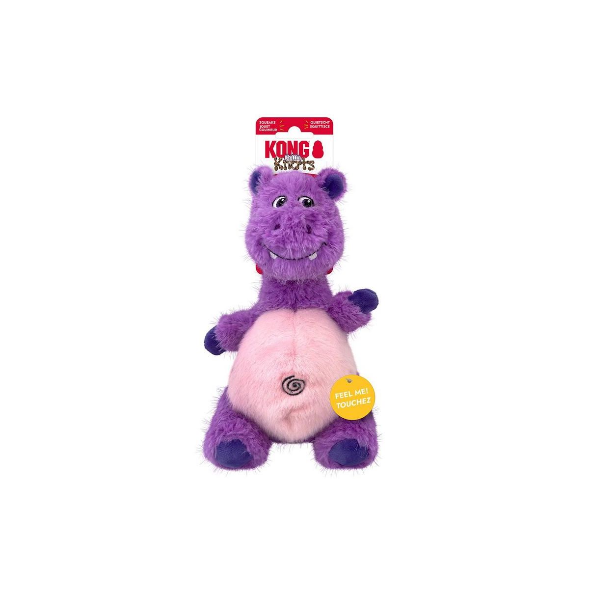 KONG Knots Belly Hippo is soft and fluffy on the outside, with a dense rope inner frame that adds resistance and movement and encourages shaking, tossing and light chewing. A squeaker on the head encourages play. Its soft plush exterior is also ideal for wearing and snuggling during naps. The inner rope frame knotted on the belly adds resistance and movement. The squeaker on the head stimulates interest. Its dense body satisfies natural instincts to shake, throw and chew. Multifunctional toy for dogs offering a variety of play possibilities.
