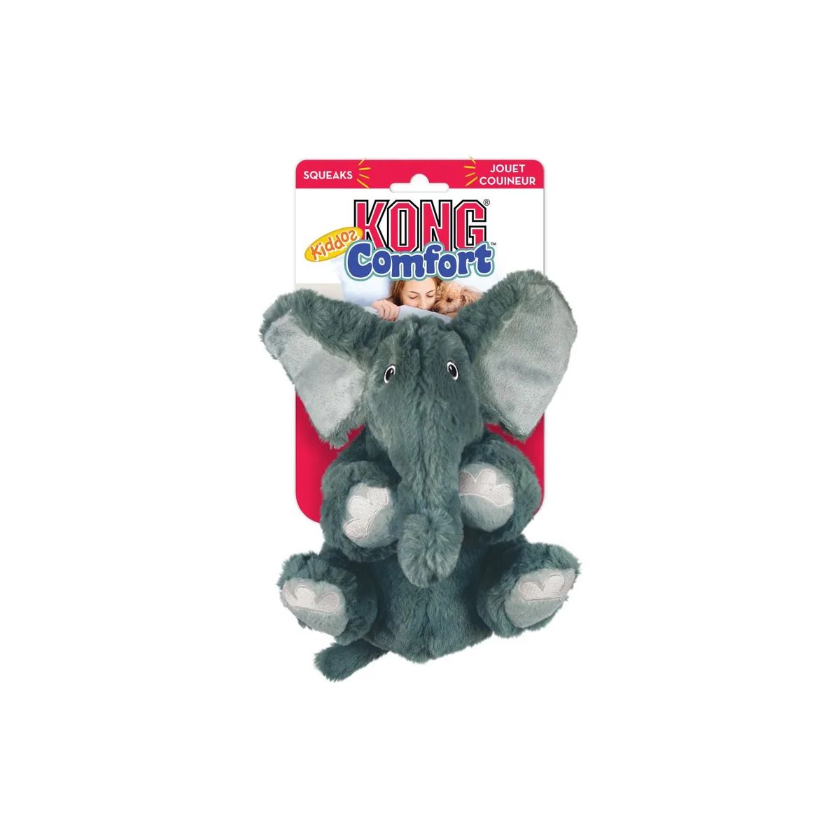 The KONG Comfort Kiddos Elephant toy is perfect for playing and cuddling with your dog. It features a small, low-pitched whistle to pique your pet's curiosity and a removable whistle for quiet moments. The whistle easily detaches for cuddles and then reattaches for plenty of indoor playtime.