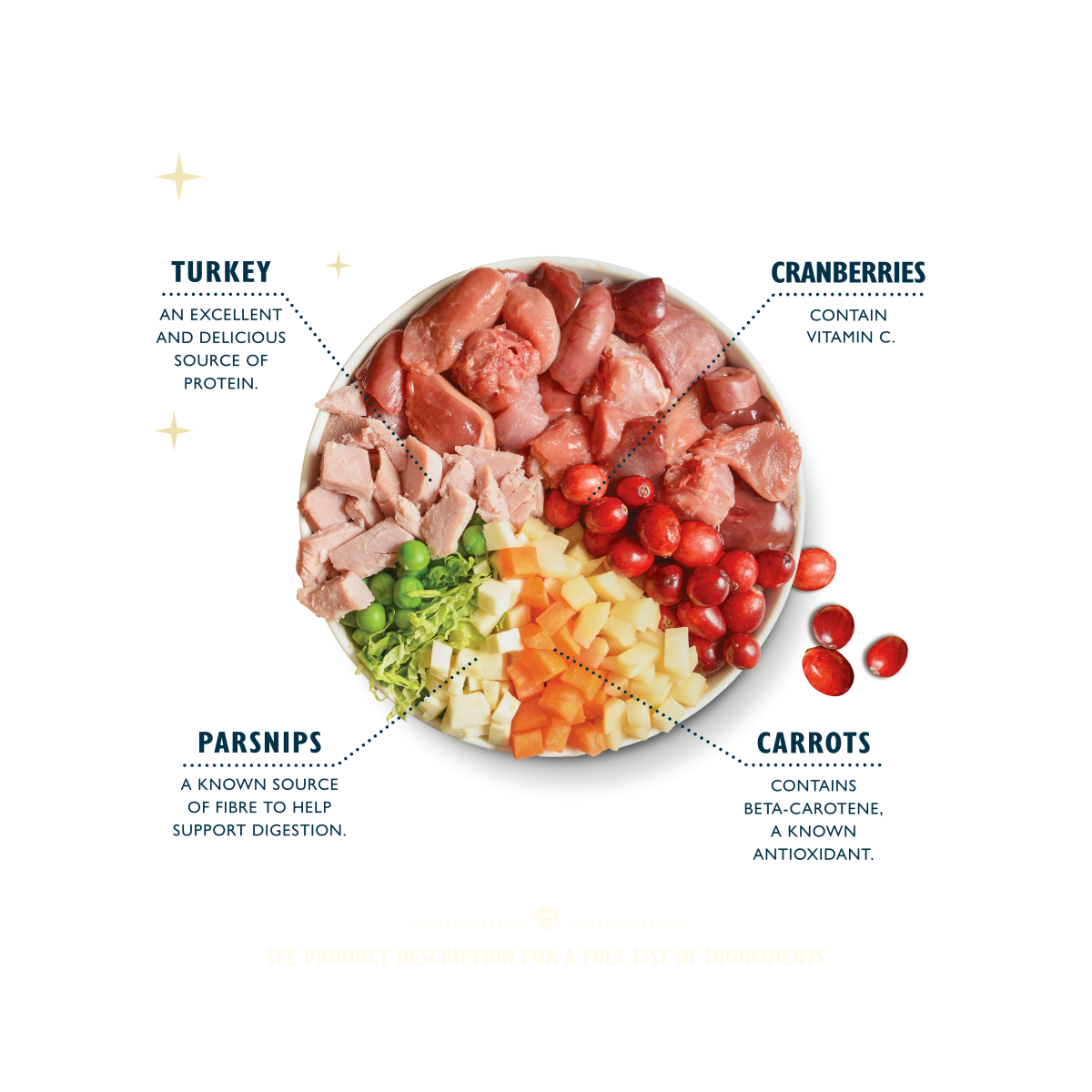 Ingredients: Turkey* (50%), ham* (10%), cranberries* (3%), potatoes* (2%), parsnips* (2%), carrots* (2%), cabbage* (1%), peas* (1%), minerals, sage*, thyme*, goldenrod*, nettles*, anise*, rosehips*, marigold flowers*, bedstraw*, chickweed*, alfalfa*, milk thistle*, dandelion root*, burdock root*, celery seed*.