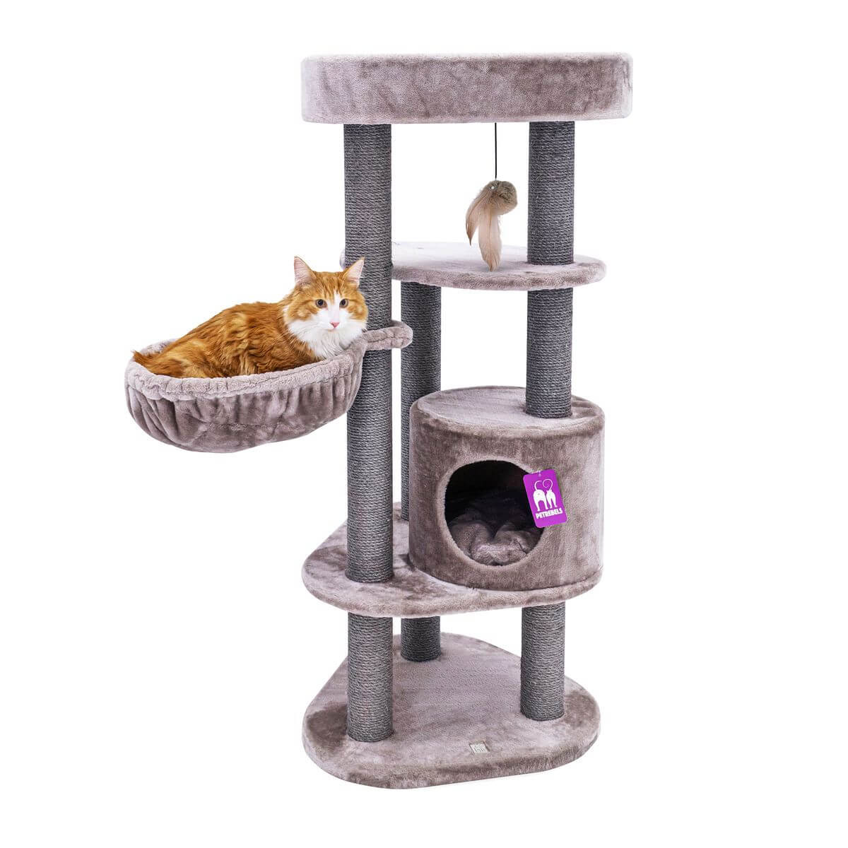 Trunk diameter: 9 cm Robust 5.2 mm natural sisal, dyed grey, specially glued Base plate dimensions: 59x56cm/height 4cm Sleeping cave dimensions: 40×40/height 30cm Mass hammock: 40x40cm (up to 30 kg load capacity) removable pillow washable at 30 degrees Weight: approximately 25.16 kg