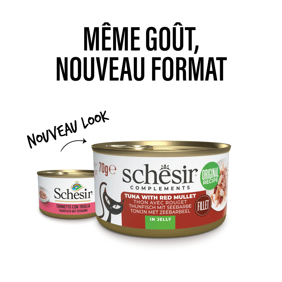 Complementary wet food for adult cats Tuna with red mullet in jelly.