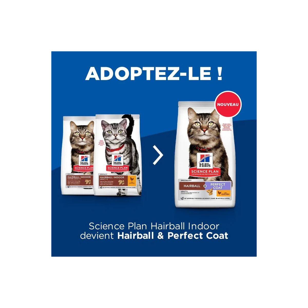Hill's Science Plan Hairball & Perfect Coat - Croquettes pour Chat Adulte - au Poulet a été formulé pour aider efficacement à éviter la formation de boules de poils chez le chat adulte tout en favorisant un beau pelage. Grâce à son mélange d’acides gras essentiels Oméga-6, cet aliment est bénéfique pour la peau et le pelage du chat, les maintenant sains et brillants. Notre technologie Advanced Fibre aide à réduire les boules de poils en favorisant naturellement leur passage dans l’intestin. Cet aliment est formulé avec des protéines de haute qualité pour une recette parfaitement équilibrée et savoureuse.