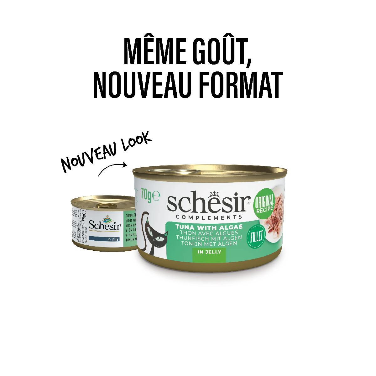 Véritables filets de thon cuits à la vapeur avec algues en gelée, pour un mélange naturel et irrésistible. Aliment humide complémentaire pour chat adulte recette thon avec algues en gelée.